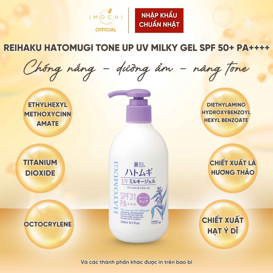 + Reihaku Hatomugi Tone Up UV Milky Gel SPF 50+ PA++++ (250ml): Chống nắng, dưỡng ẩm, nâng tone