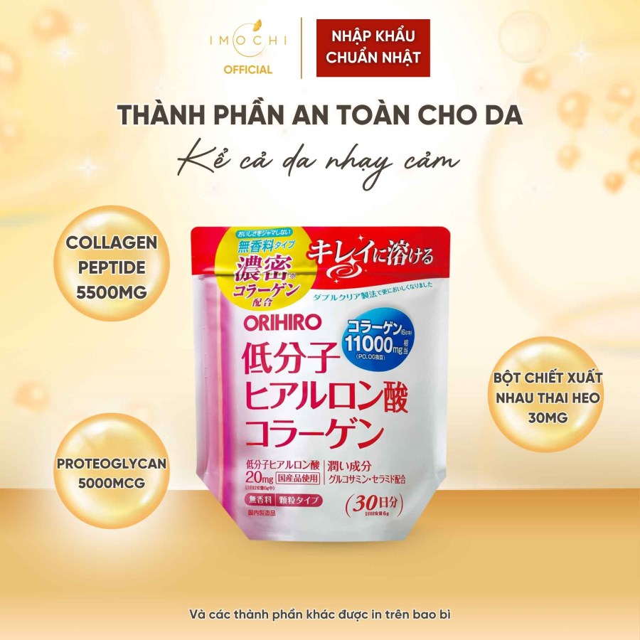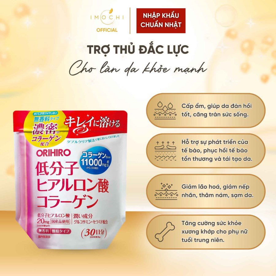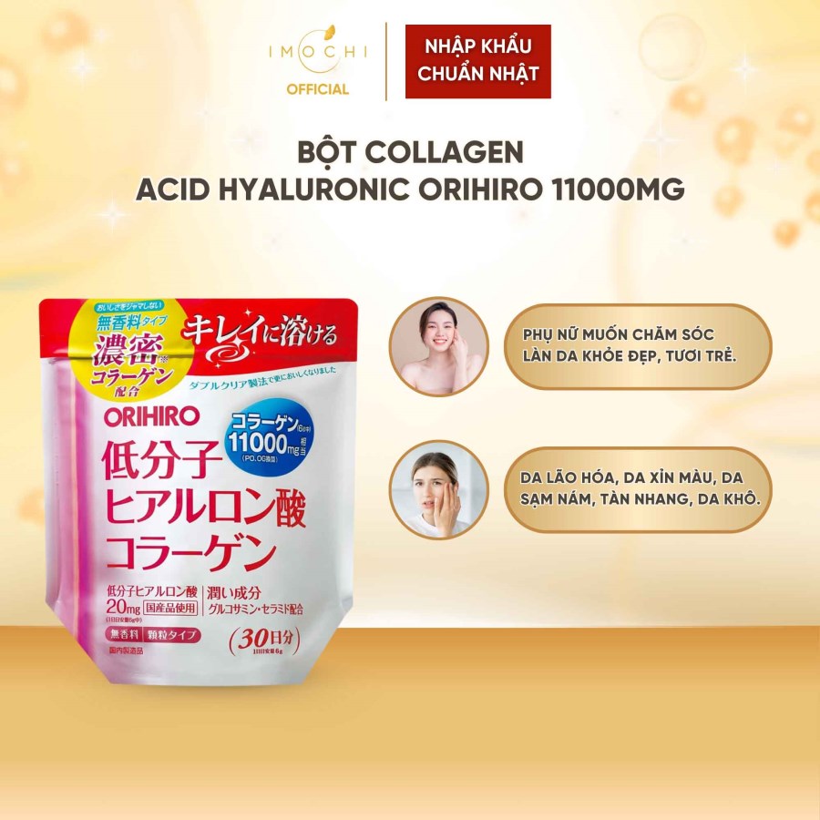 - Bột Collagen Acid Hyaluronic Orihiro kết hợp các thành phần làm đẹp da chất lượng tốt với nhau như: collagen peptide đậm đặc, chiết xuất sụn mũi cá hồi chứa Proteoglycan, bột chiết xuất nhau thai heo 30mg