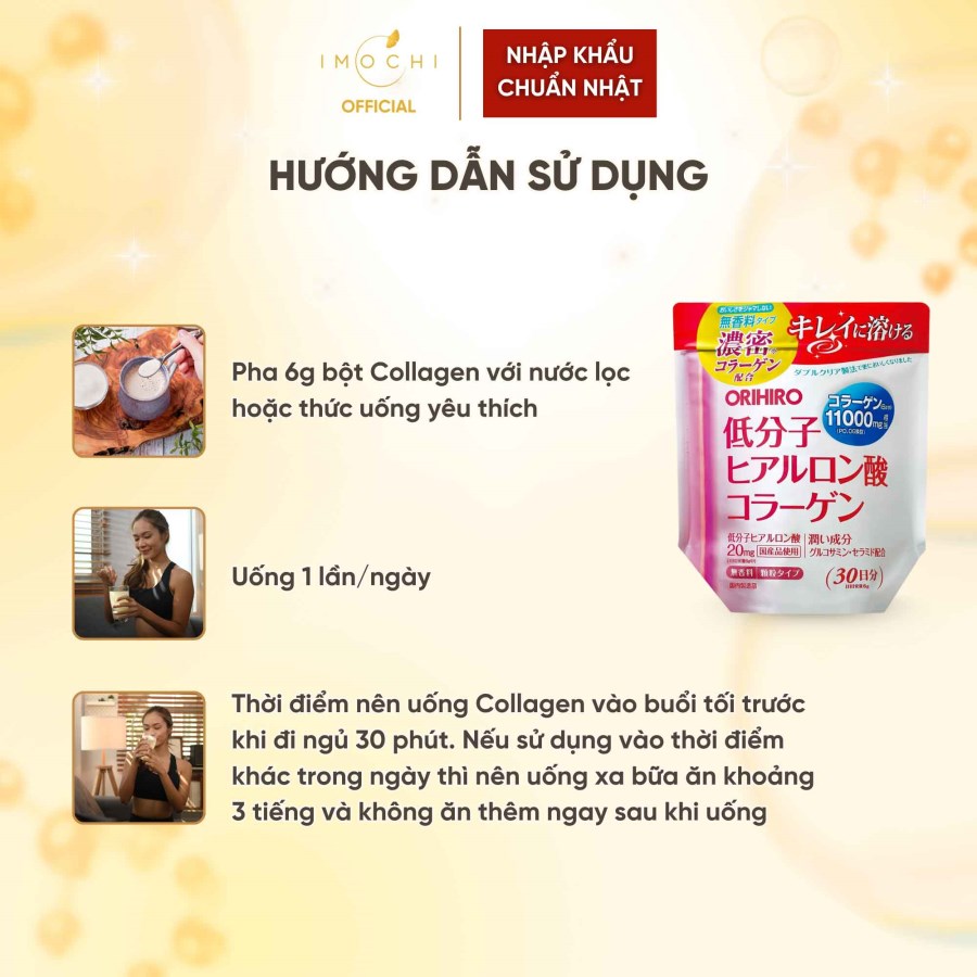 Trong Vòng 7 Ngày- Hàm lượng Collagen bổ sung trong bột Collagen Acid Hyaluronic Orihiro rất cao lên đến 11000mg. Theo ước tính sau tuổi trưởng thành, cơ thể mất khoảng 1% Collagen mỗi năm. Do đó, cung cấp Collagen hàm lượng cao cho cơ thể là điều cần thiết, đặc biệt với chị em phụ nữ sau tuổi 30.