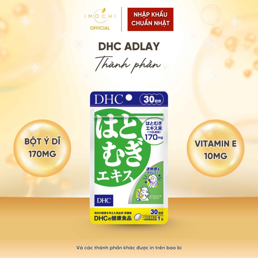 - Thành phần: Mỗi viên uống ý dĩ Adlay DHC có chứa Bột ý dĩ 170mg, Dầu thực vật chứa vitamin E 90% (dầu đậu nành, dầu cải, dầu ngô, dầu hướng dương, dầu bông) 11.25 (tương đương vitamin E 10mg)