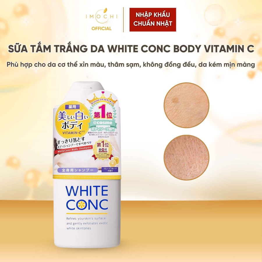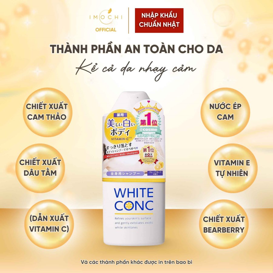 Trong Vòng 7 Ngày- Sữa tắm trắng da White Conc Body Vitamin C chứa các thành phần chiết xuất từ thiên nhiên: dẫn xuất Vitamin C từ chiết xuất cam chanh, Aburtin từ chiết xuất dâu tằm, vitamin E tự nhiên, chiết xuất bearberry...