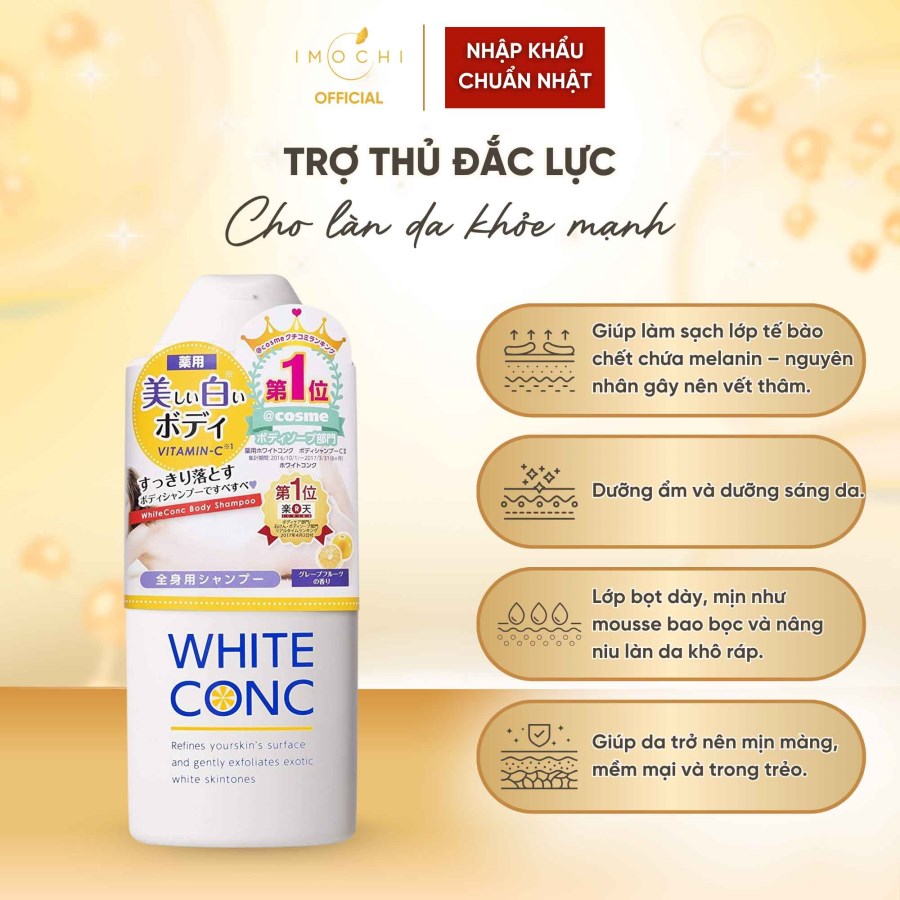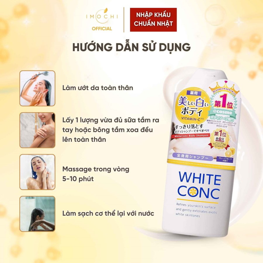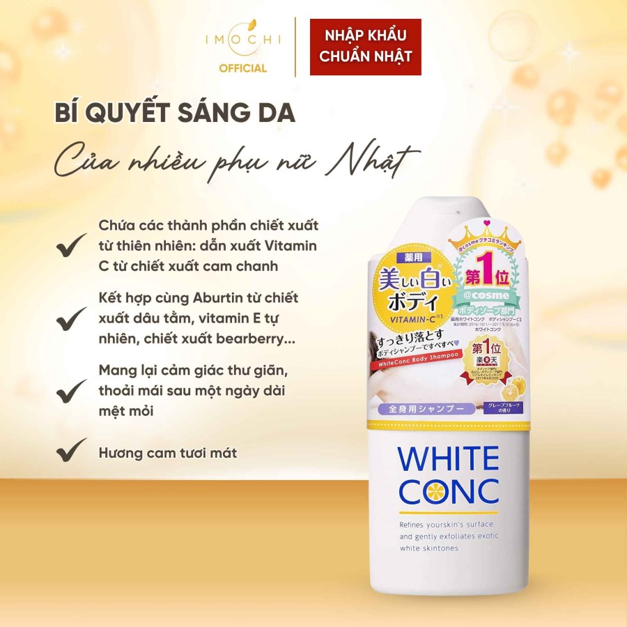 - Với hương cam tươi mát, sữa tắm White ConC mang lại cảm giác thư giãn, thoải mái sau một ngày dài mệt mỏi.