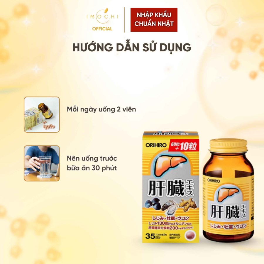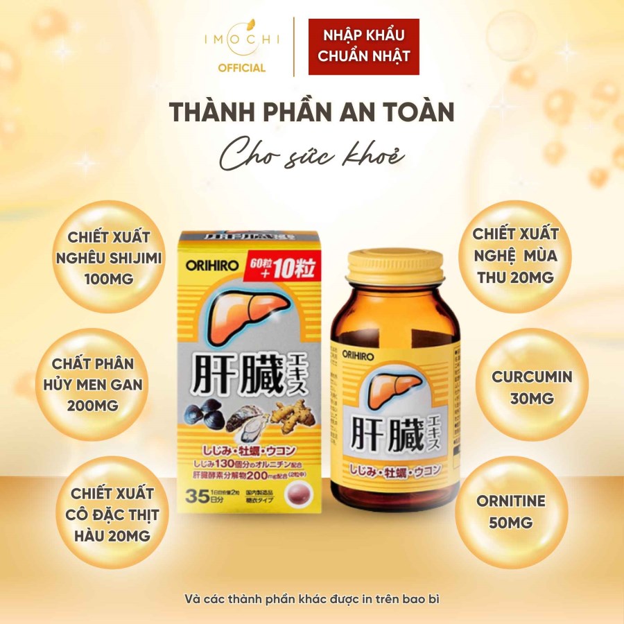 - Thành phần: Trong 2 viên uống chứa Bột chiết xuất nghêu Shijimi 100mg, Chất phân hủy men gan 200mg, Bột chiết xuất cô đặc thịt hàu 20mg, Bột chiết xuất nghệ mùa thu 20mg, Curcumin 30mg, Ornitine 50mg, Inositol 5mg, Vitamin B1 5mg, Vitamin B2 2mg, Vitamin B6 3mg, Vitamin B12 2μg, Acid Folic 200μg, Kẽm 1mg