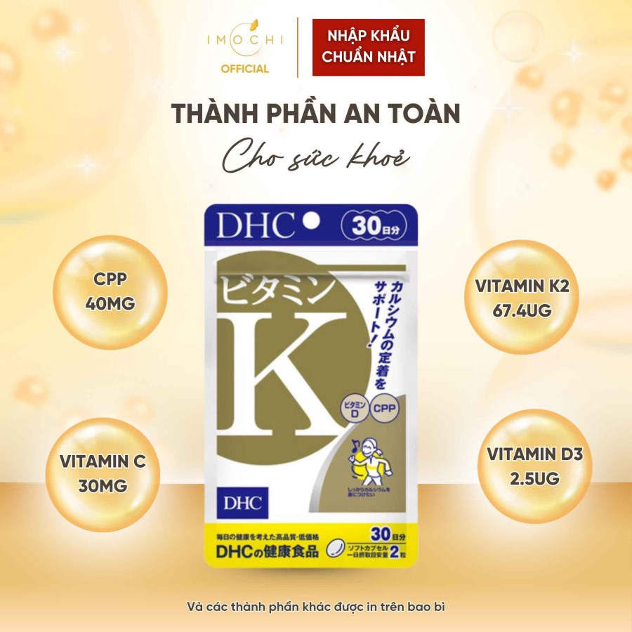 - Thành phần: Trong 2 viên uống vitamin K DHC chứa CPP (casein phosphopeptide từ sữa) 40mg, Vitamin C (từ ascornic acid) 30mg, Vitamin K2 (từ menaquinone) 67.4ug, Vitamin D3 (từ cholecalciferol) 2.5ug
